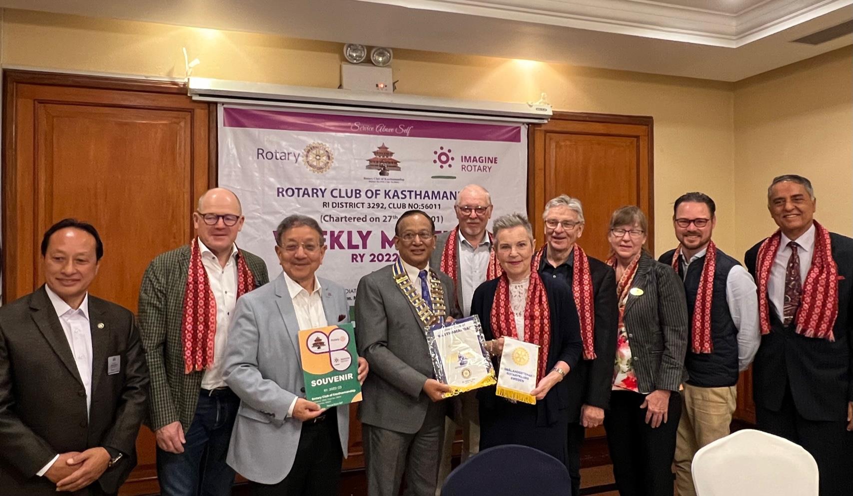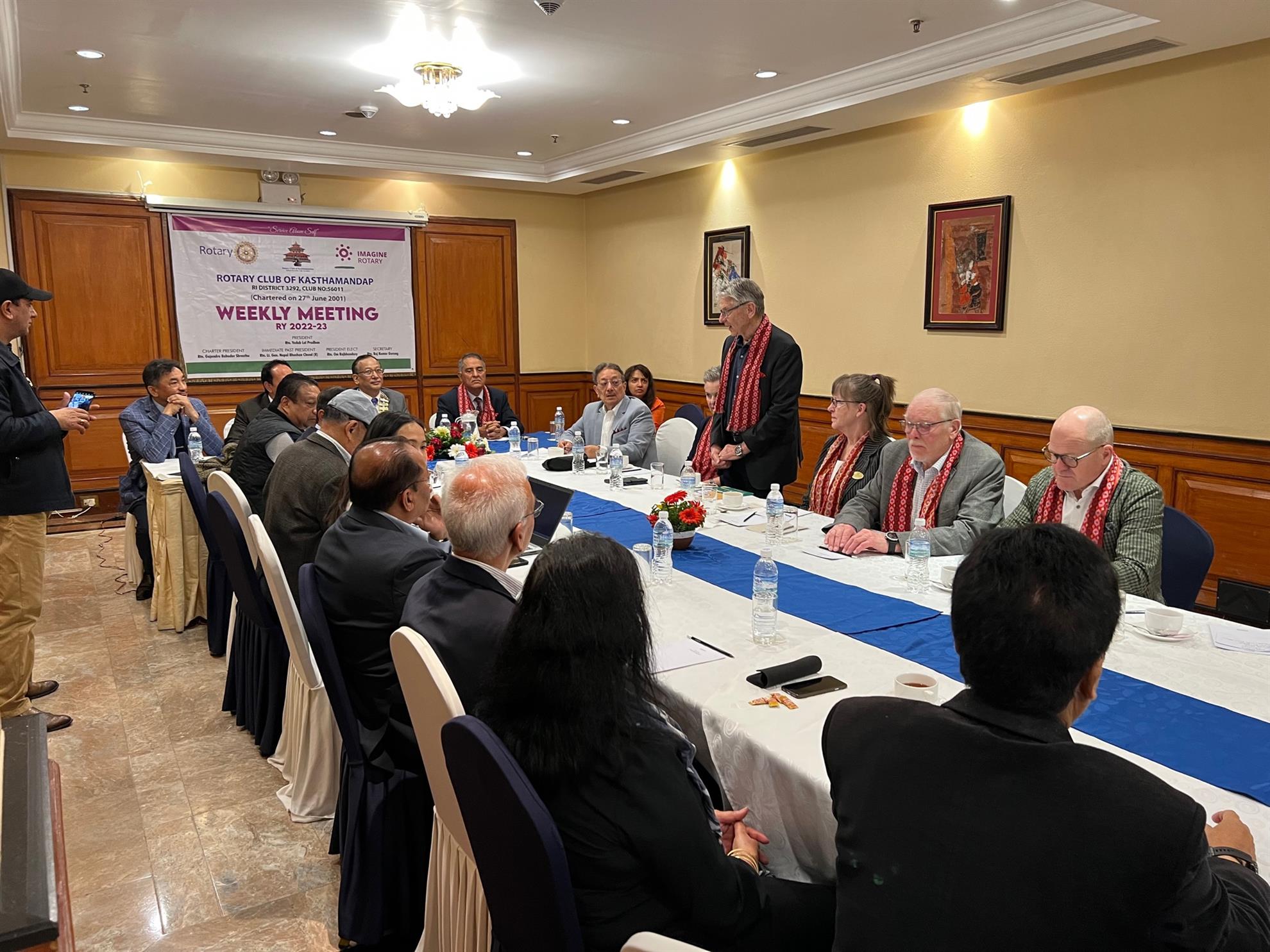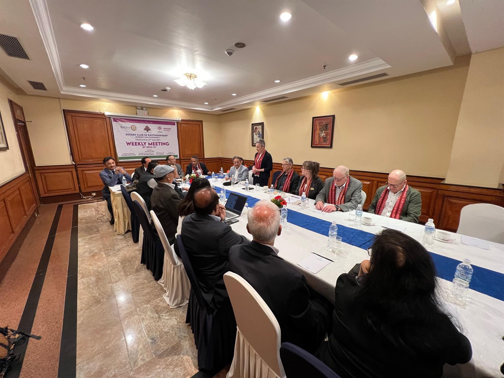 Fredagen den 7 april besökte vi Rotary Club of Kasthamandap i Kathmandu på deras frukostmöte. Vi blev varmt välkomnade och förärades med var sin halsduk på nepalesiskt vis. På fotot ser ni även mötets föredragshållare som har arbetat för FN under många år. Han hade ett mycket intressant föredrag om hur våra hjärnor fungerar och hur vi tar beslut efter våra känslor och sedan finner logiska anledningar för att rättfärdiga dem. Tyvärr kunde vi inte vara med under hela mötet då de har betydligt längre möten än vad vi är vana vid. Mycket var likt jämfört med våra möten men vid mötets början så applåderade medlemmarna när Presidenten tog på sig kedjan och därefter påkallade Presidenten "50 seconds to God" då samtliga stod tysta. Mindre tysta var de senare när presidenten talade. Det var ganska mycket prat och mobilsignaler vilket vi som svenskar upplevde som lite annorlunda.